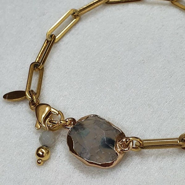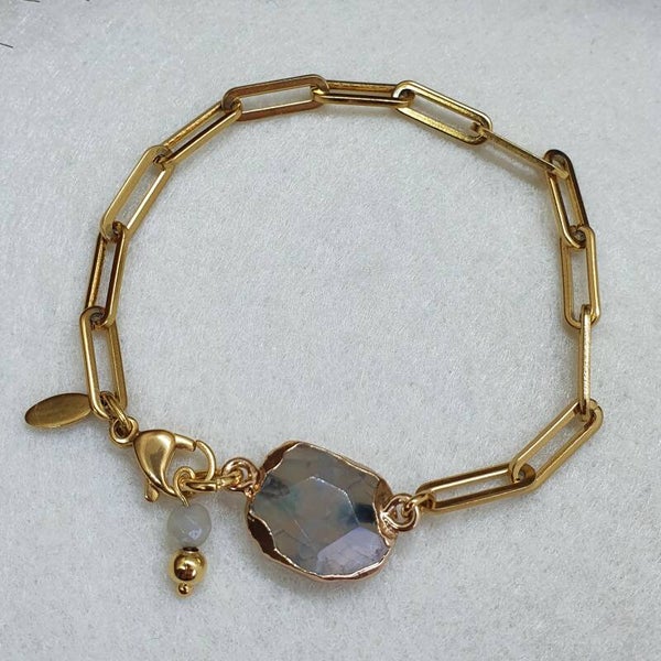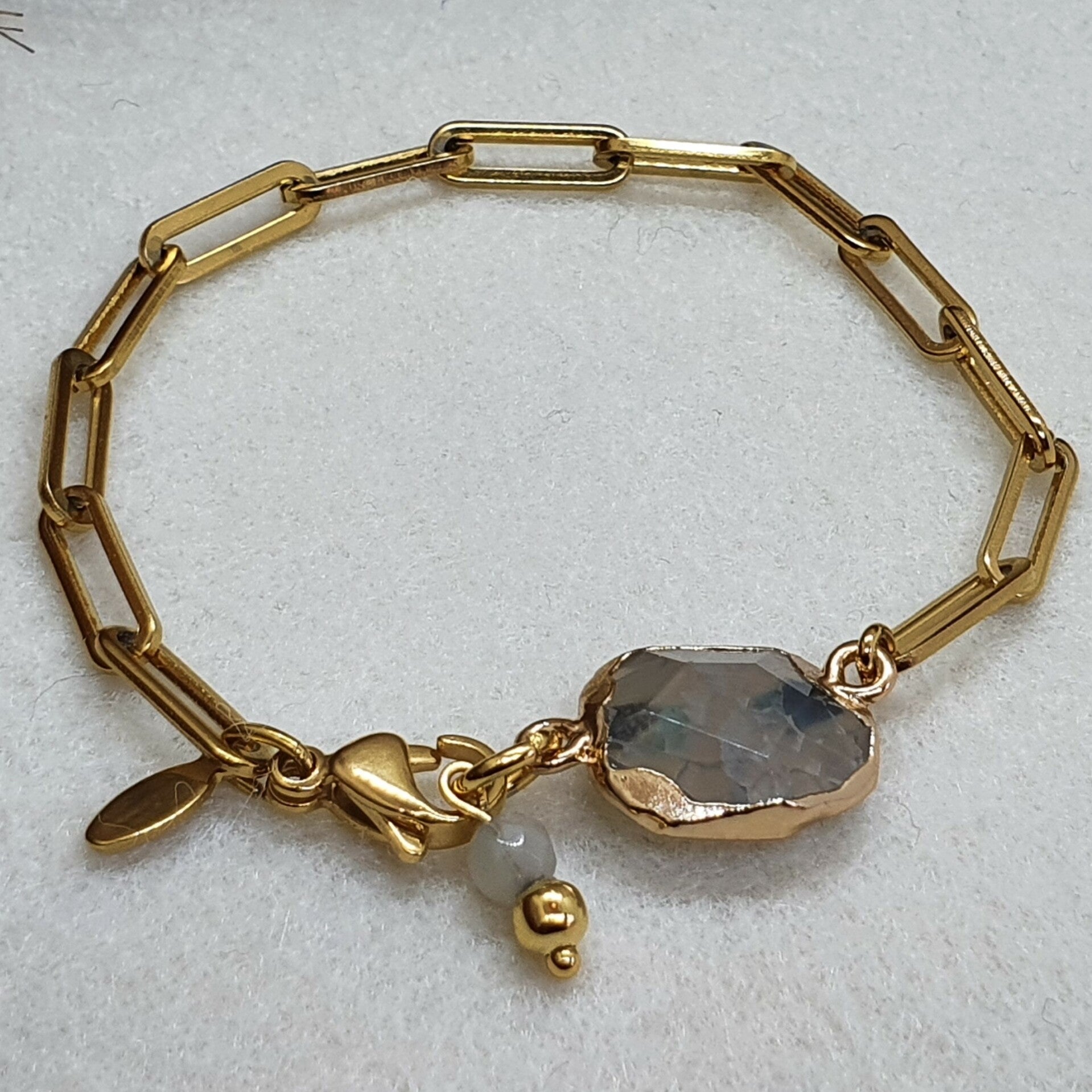Een mooi schakelarmbandje met connector van natuursteen. Het schakelarmbandje heeft rechthoekige schakels en is van Stainless Steel. De standaardlengte is +/- 19 cm. Wil je een kleinere of grotere maat, geef dit dat aan wanneer je besteld bij het kopje opmerkingen.
