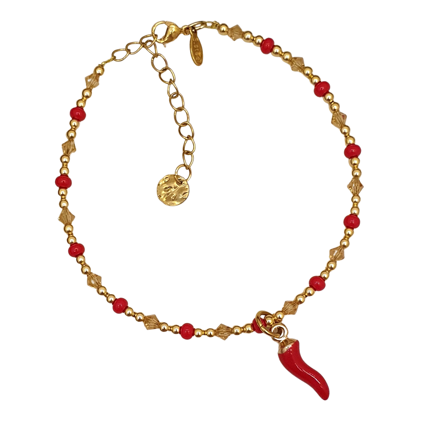 Een zomers enkelbandje met gouden Stainless Steel kralen, rode kraaltjes en een pepertje. Door het verlengkettinkje is dit enkelbandje verstelbaar tussen de 22- 27 cm.