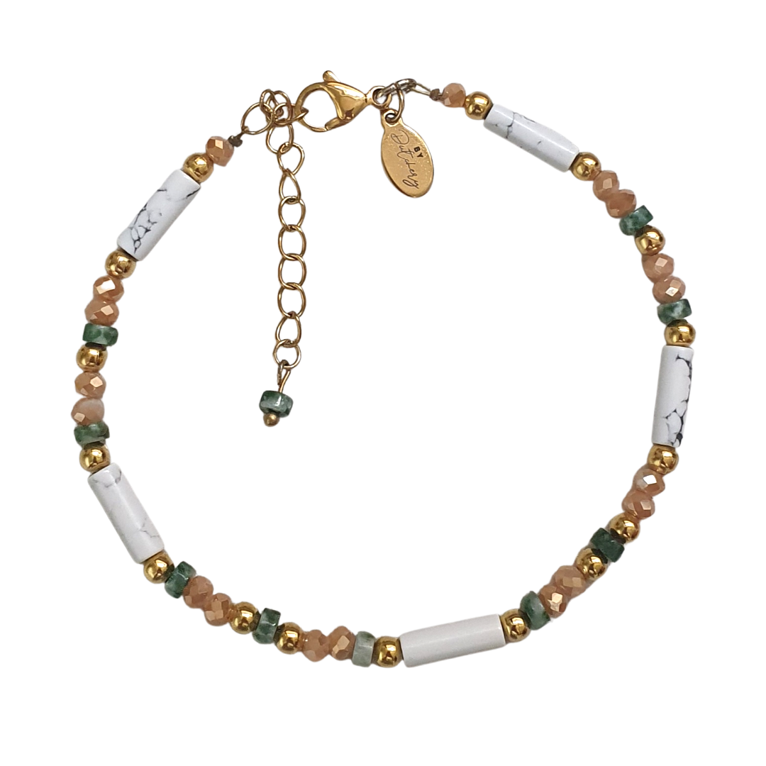 Een enkelbandje ontworpen door Jeanique (@madewithcwtch op Instagram) met gouden Stainless Steel kralen, groene natuursteentjes en zachtrose facetkraaltjes. Wist je dat Cwtch een warme knuffel betekent die je het gevoel van thuis geeft? Past toch perfect bij dit ontwerp? Door het verlengkettinkje is dit enkelbandje verstelbaar tussen de 22- 27,5 cm.