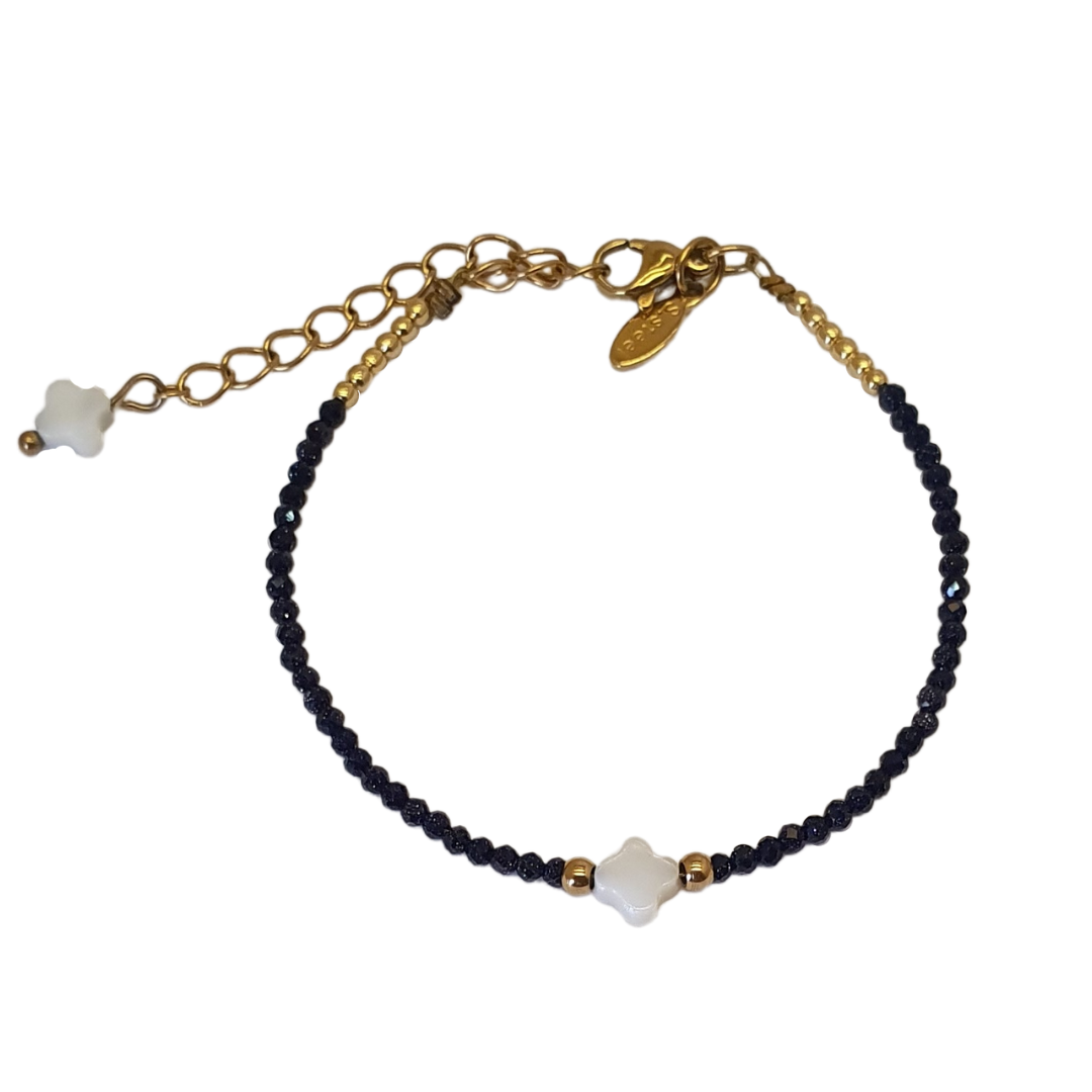 Subtiel armbandje met donkerblauwe natuursteentjes en gouden kralen van stainless steel. In het midden een parel klavertje.