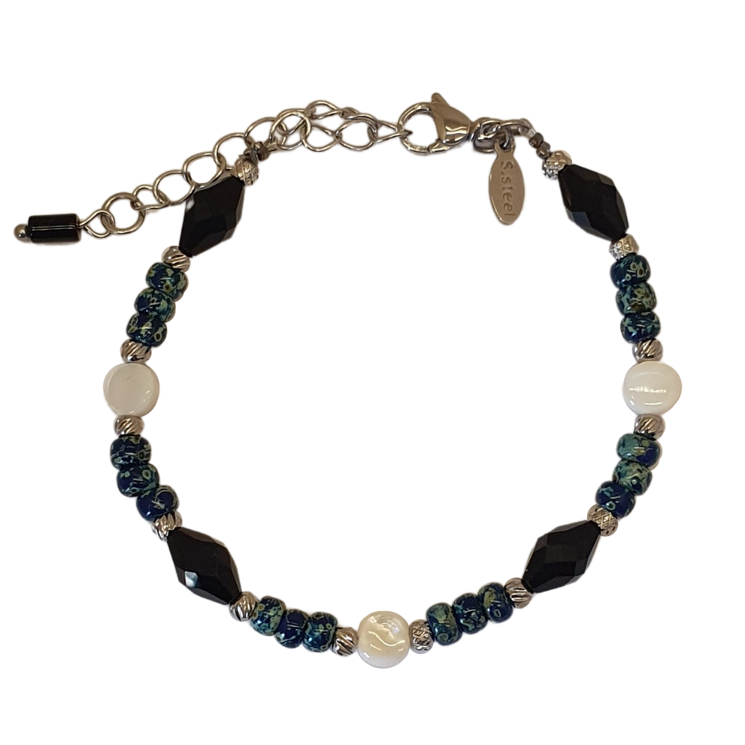 Donkerblauwe kralenarmbandje met leuke verschillende kralen.